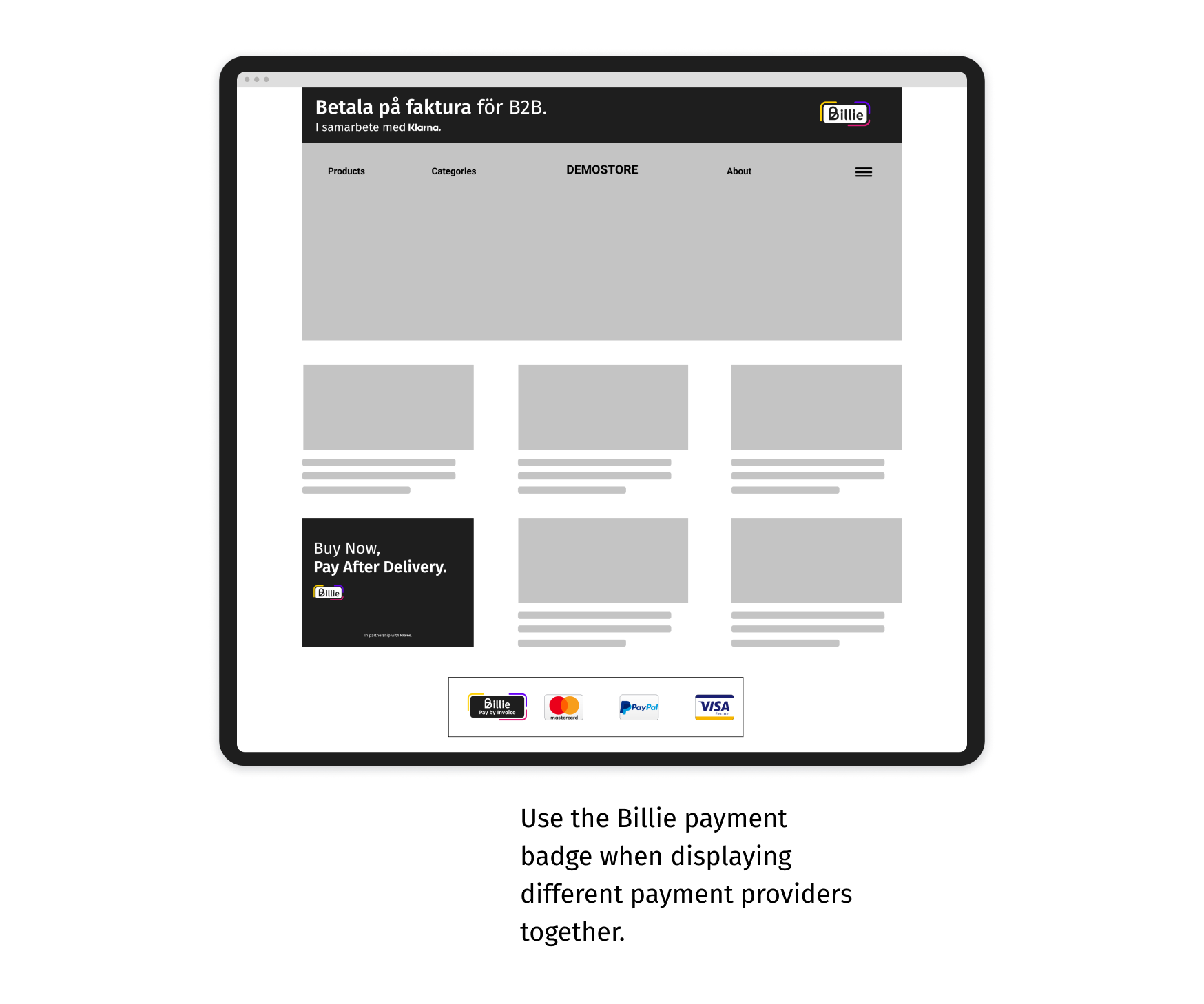 Use banners and payment badges on your website and direct channels to let customers know they can use Billie to pay later. Display our payment option early in the shopping journey to boost sales and increase average order value.